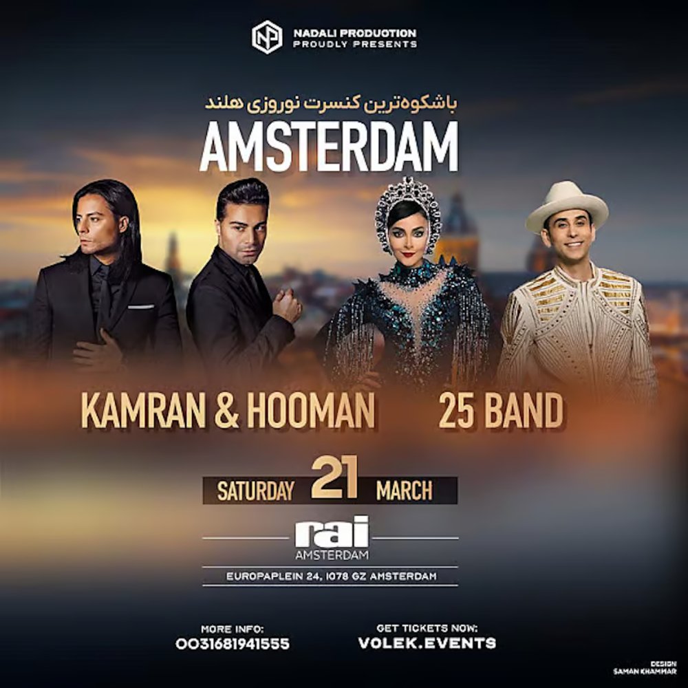 Nadali Production presenteert op zaterdag 21 maart het Norooz Gala in RAI Amsterdam. Een verfijnde avond waarin muziek, cultuur en elegantie samenkomen ter gelegenheid van Nowrooz 1405. Met liveoptredens van Kamran & Hooman en 25Band, aangevuld met hoogwaardige entertainment acts, biedt het gala een stijlvolle ervaring in een bijzondere setting. Noteer de datum en vier de start van het nieuwe jaar.