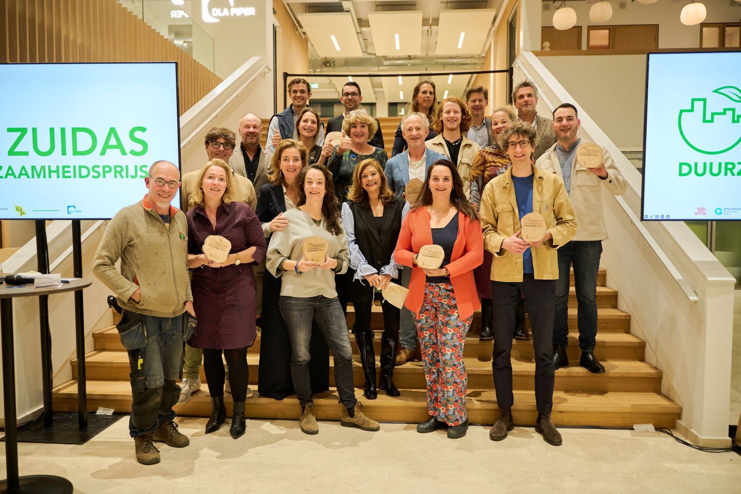 Tijdens de feestelijke uitreiking bij DLA Piper zijn zes projecten van bedrijven in de Zuidas onderscheiden voor hun bijdrage aan duurzaamheid in het gebied. Uitgereikt door juryleden Yvette Watson, Maurits Groen, Ruth Jansen, Victor Nieuwenhuizen, Margreet Van Gastel, en wethouder Rocco Piers.
