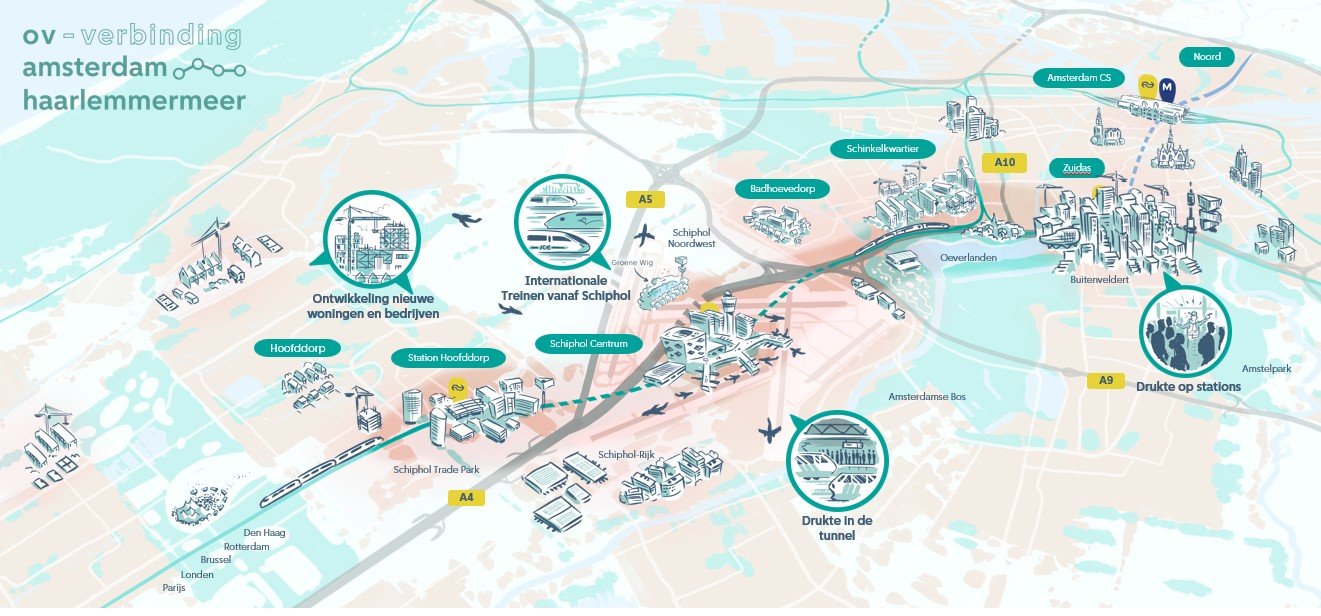 Op het plangebied zie je het gebied waarin de nieuwe OV-verbinding tussen Amsterdam en Haarlemmermeer gerealiseerd moet worden. Je ziet op de kaart onder andere de grootste knelpunten: drukte op stations Amsterdam Zuid en Schiphol Airport, drukte in de Schipholspoortunnel, relatief weinig ruimte voor internationale treinen en tenslotte nieuwe woningen en bedrijven die ontsloten moeten worden.