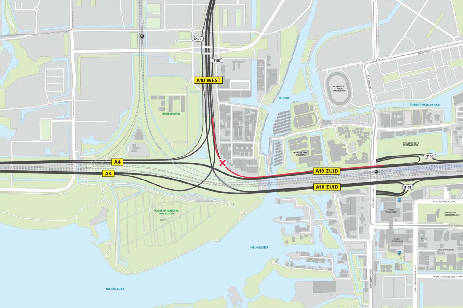 Van vrijdag 12 december om 22.00 uur tot maandag 15 december om 5.00 uur is de verbindingsweg van de A10 Zuid naar de A10 West afgesloten vanwege werkzaamheden aan de nieuwe fly-over bij knooppunt De Nieuwe Meer. De fly-over maakt onderdeel uit van de reconstructie van het knooppunt en moet de doorstroming en verkeersveiligheid verbeteren.