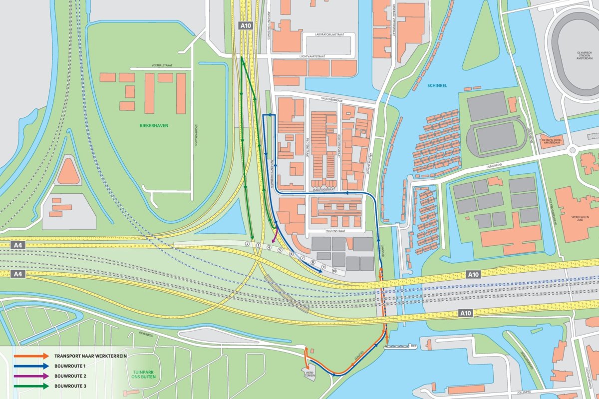 Tijdens het weekend worden ook zware bouwdelen van het werkterrein aan de Riekerweg naar de A10 West vervoerd. Verkeersregelaars begeleiden het verkeer en zorgen voor een veilige doorgang.
