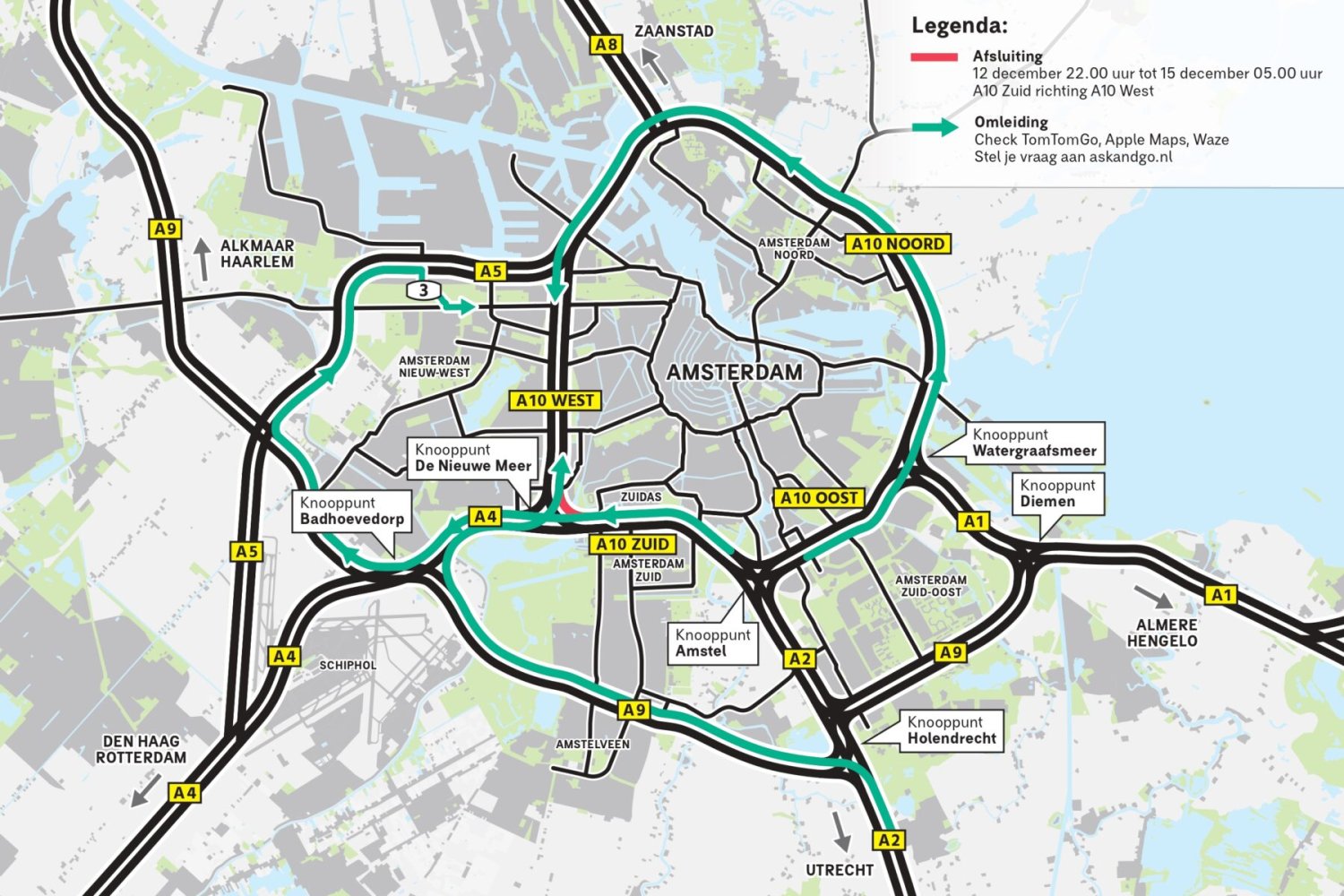 Werkzaamheden en afsluiting A10 Zuid naar A10 West van 12 tot 15 december